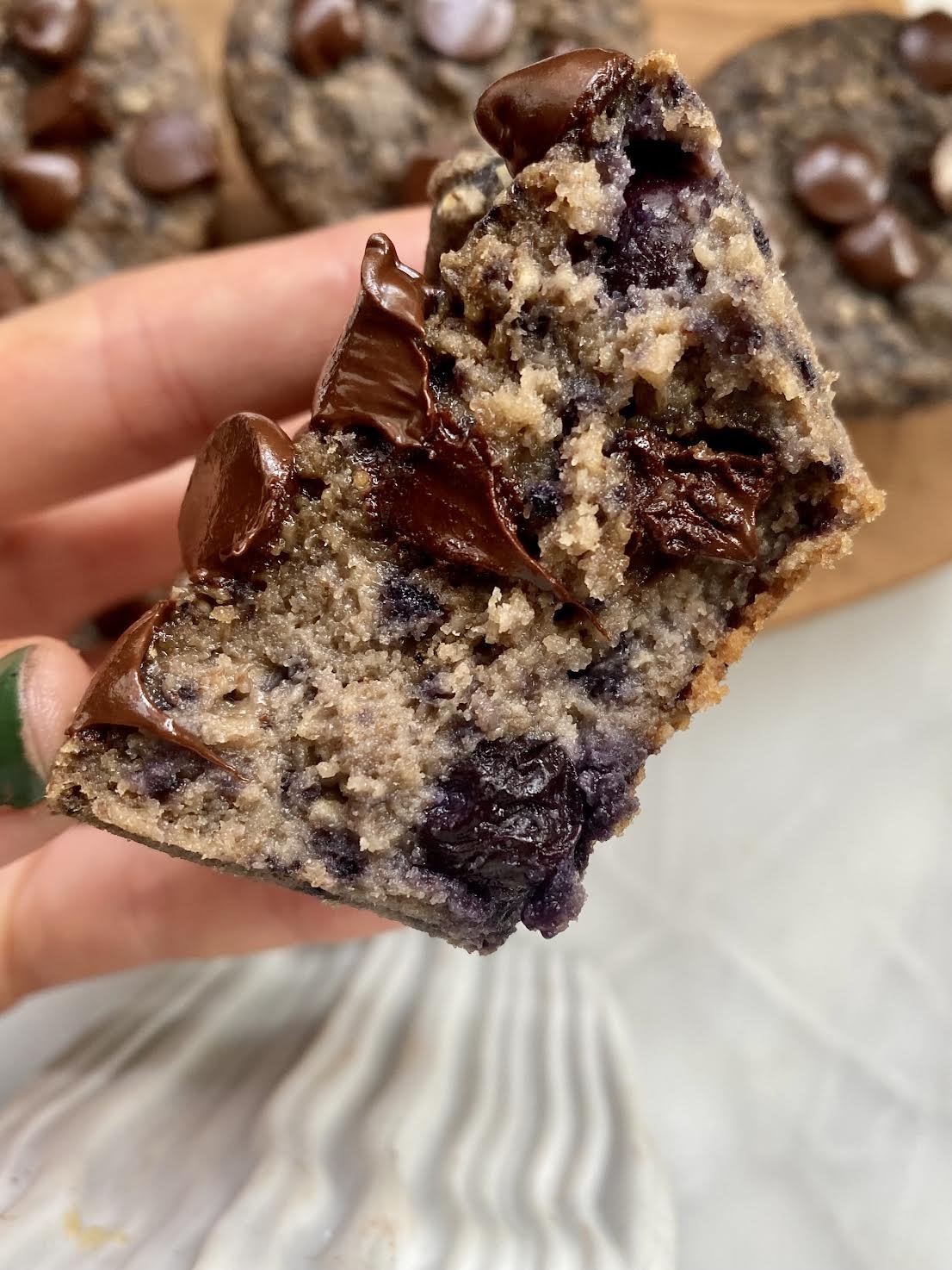 3. Add in the baking powder, oats, and almond flour. Blend until completely smooth. If you are adding chocolate chips add them now, and use a rubber spatula to fold them in. You can also add in more blueberries and fold them in as well. Transfer the batter to the cupcake pans. Optional: add more blueberries or chocolate chips on top before baking.