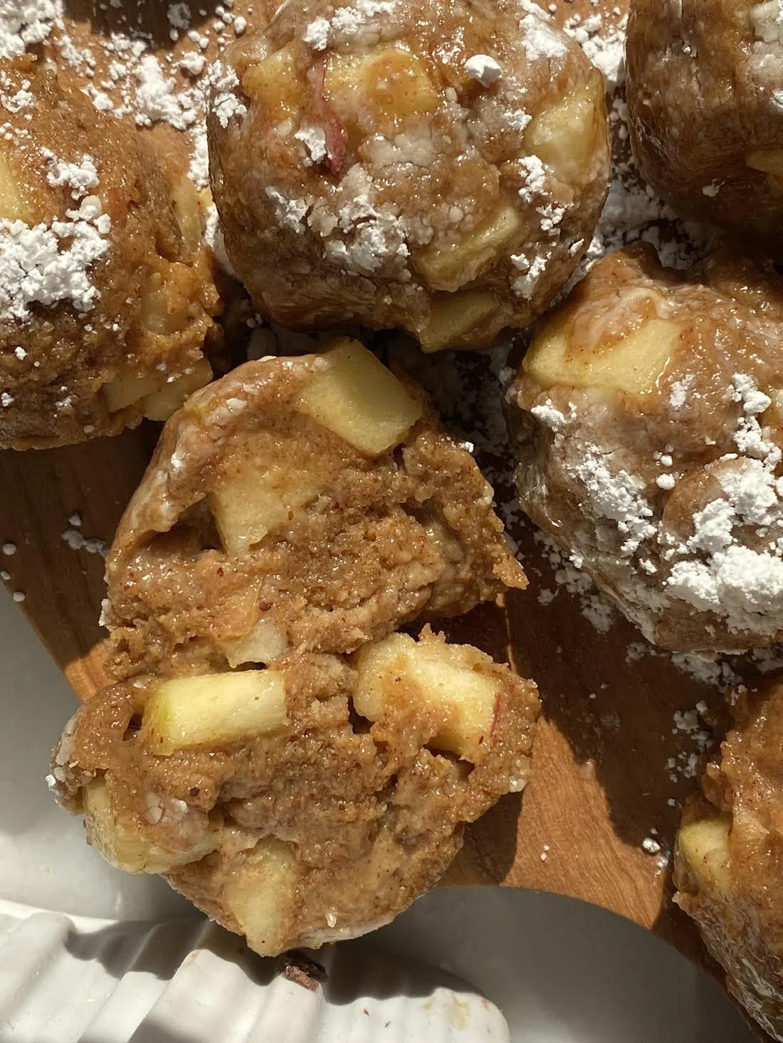 Protein bites, chopped apple folded in, coated in powdered sugar.