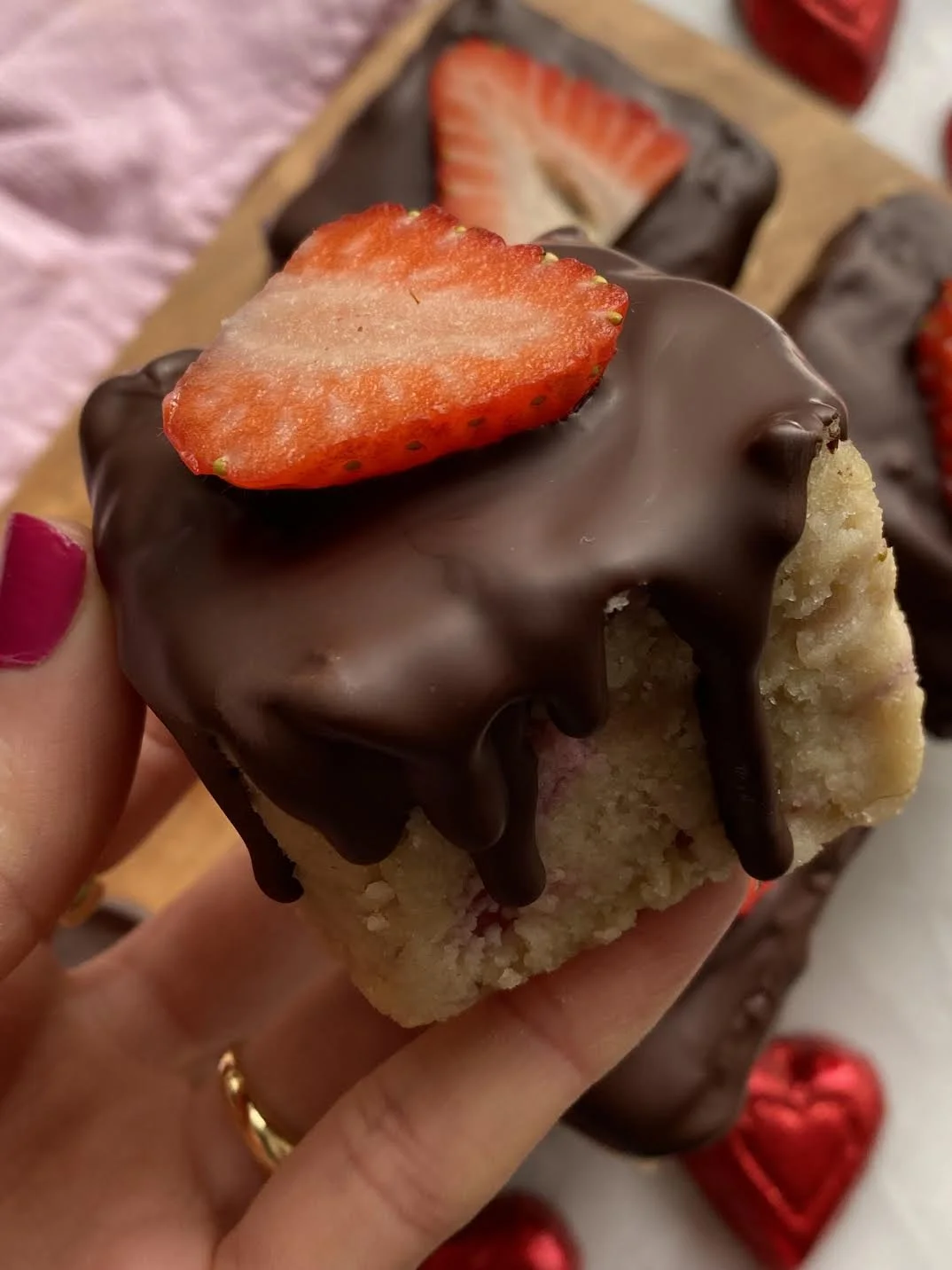 No bake protein bar with chopped strawberries + topped with chocolate.