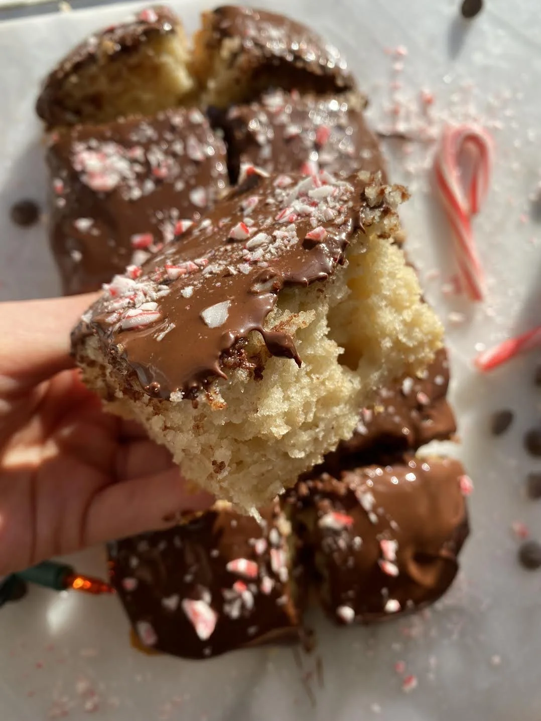 This bread has become a holiday staple. The base is a vanilla cake that is ultra-fluffy and flavorful without being overly sweet. The crunch from the crushed candy cane creates the perfect addition.