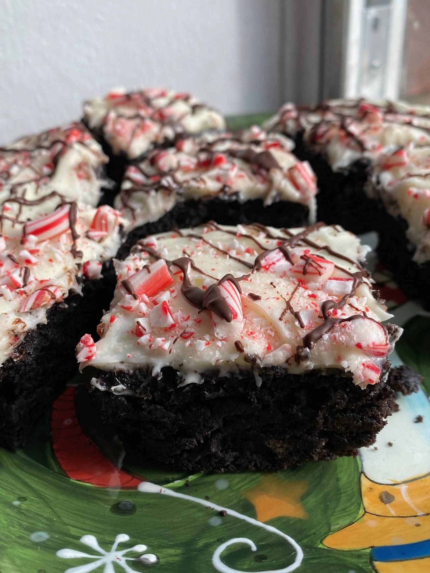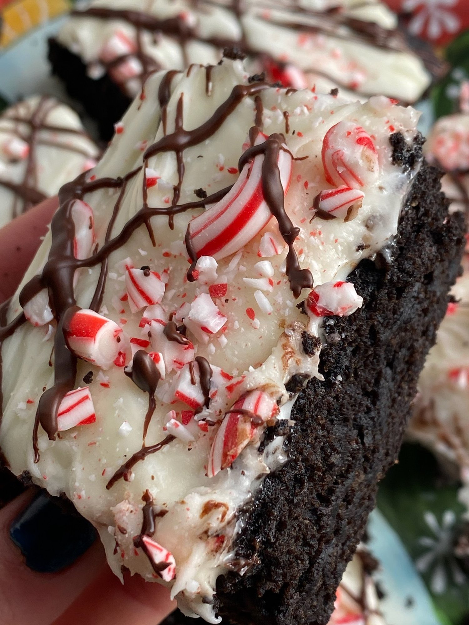 The contrast of dark, fudgy chocolate with light vanilla frosting and bright red candy cane pieces makes them not only delicious but visually stunning on any dessert table.