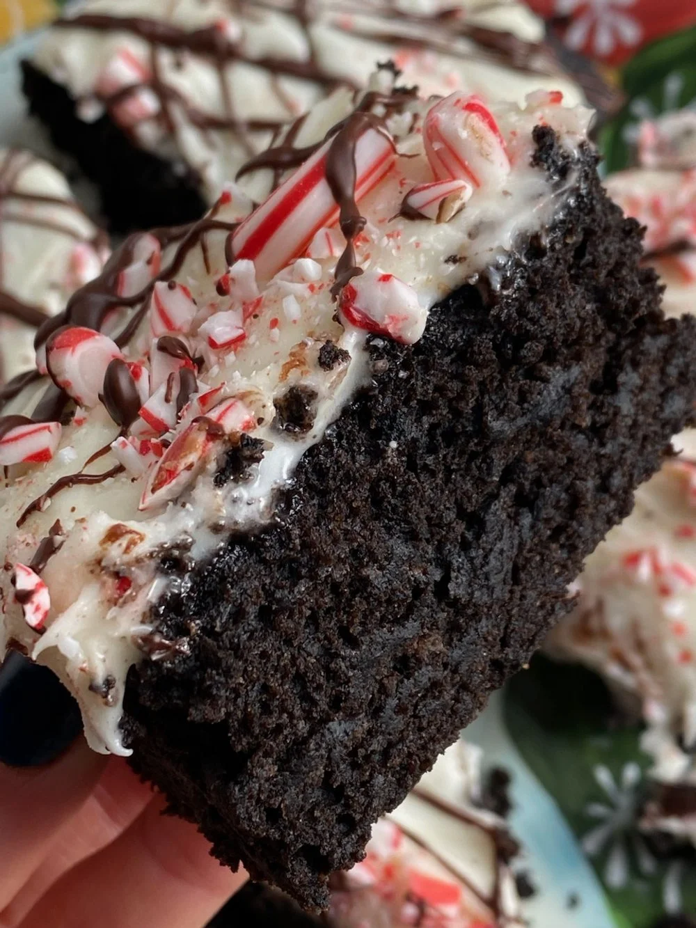 And when you top it all off with fluffy vanilla frosting and a sprinkle of crushed candy canes, you’ve got a dessert that not only tastes amazing but also looks like it came straight from a holiday bakery display.