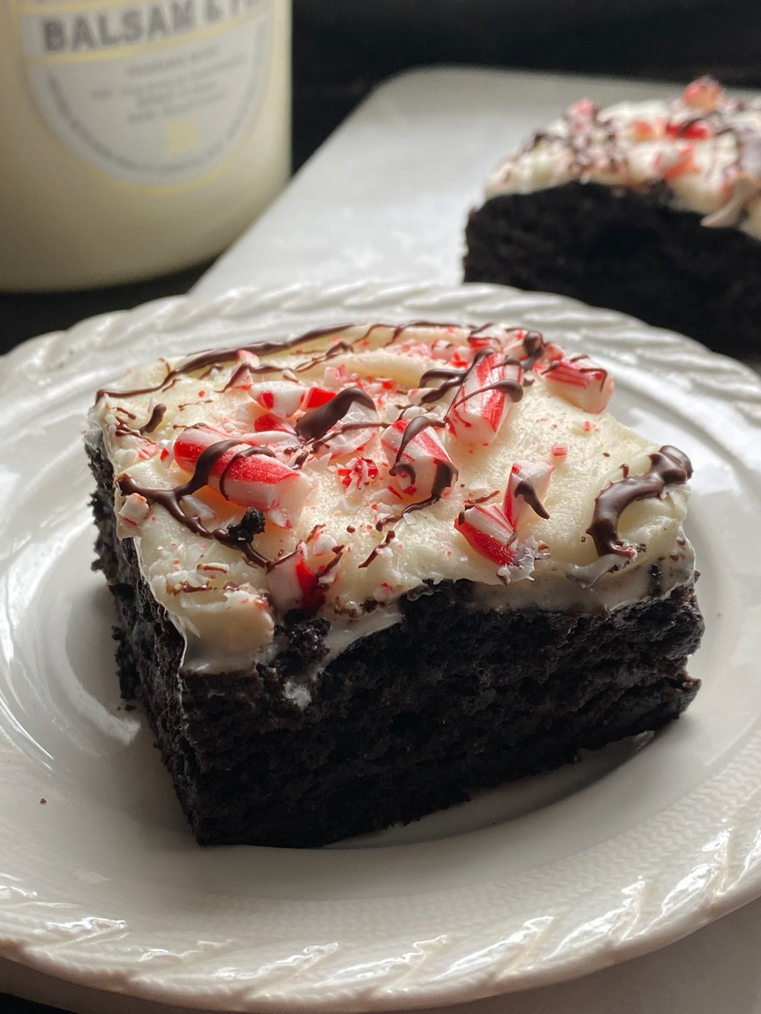 These Chocolate Peppermint Cake Bars are everything you could want in a holiday dessert: rich chocolate flavor, a hint of peppermint, creamy frosting, and a festive candy cane crunch.