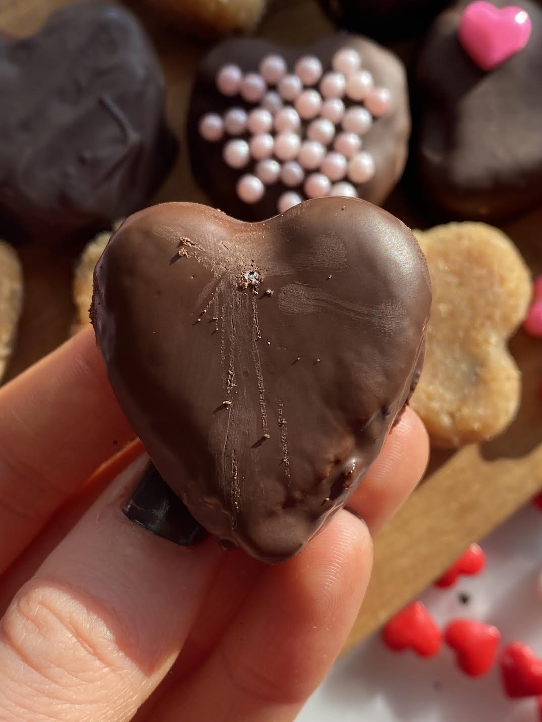 5. When the dough is done chilling, melt the chocolate. Coat each heart in the chocolate. If you’re adding sprinkles, add them now. Place back in the refrigerator to allow the chocolate to harden then enjoy!