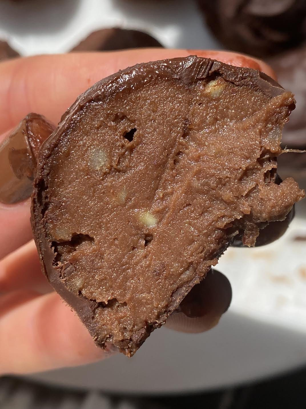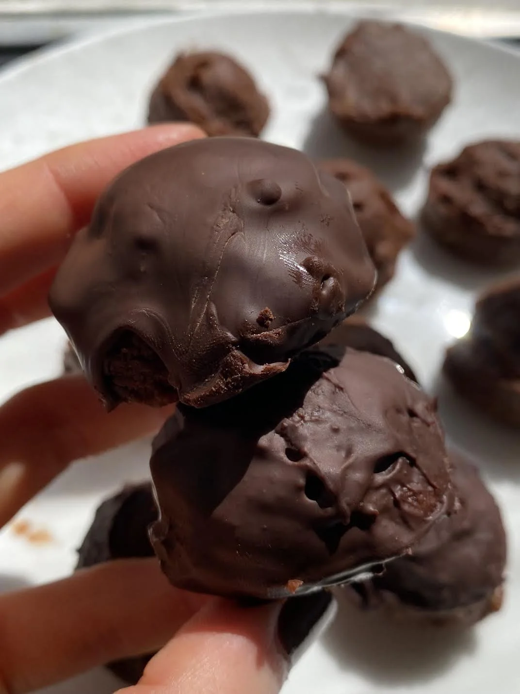 6. After the hour, melt the chocolate and coat each truffle in chocolate. Place back in the freezer to allow the chocolate to harden.