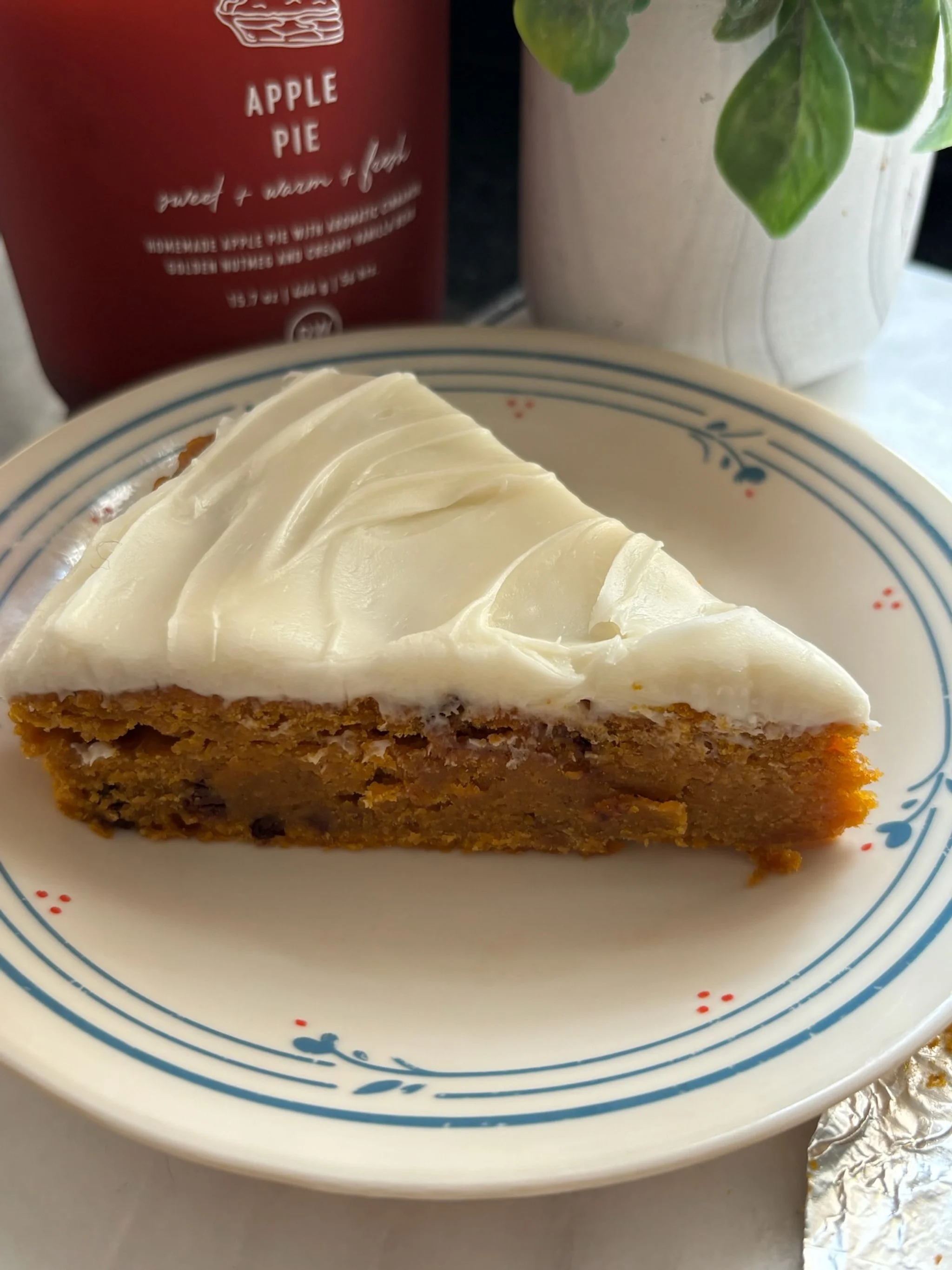Allow to completely cool before frosting and slicing into it. I used a store bought vanilla frosting. Any frosting will work.