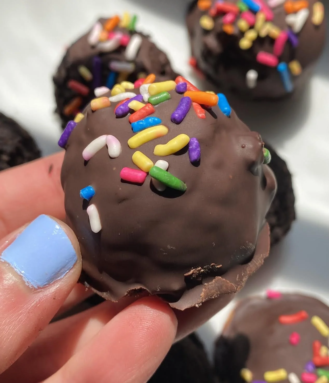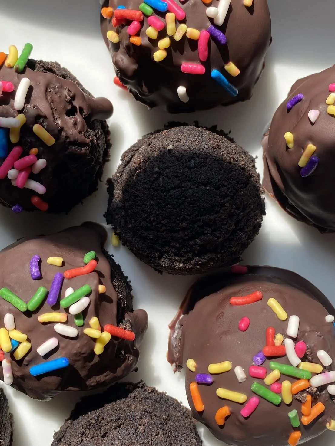 3. After the hour, melt the chocolate and coat each bite into the chocolate. Optional: top with sprinkles.