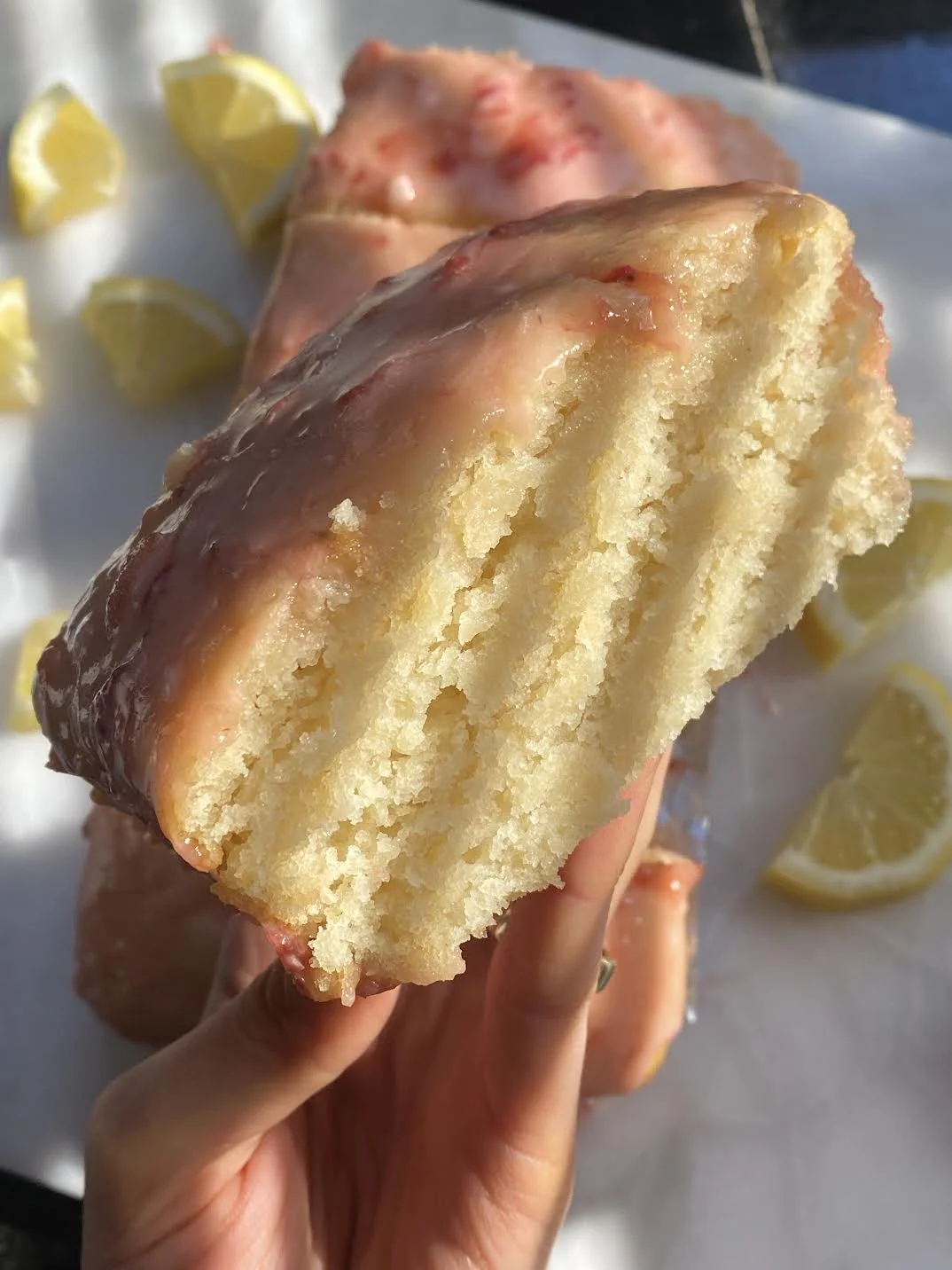 The texture is super fluffy, you would never know this recipe is vegan. The glaze is completely optional, but I find the lemon and strawberry work well together.