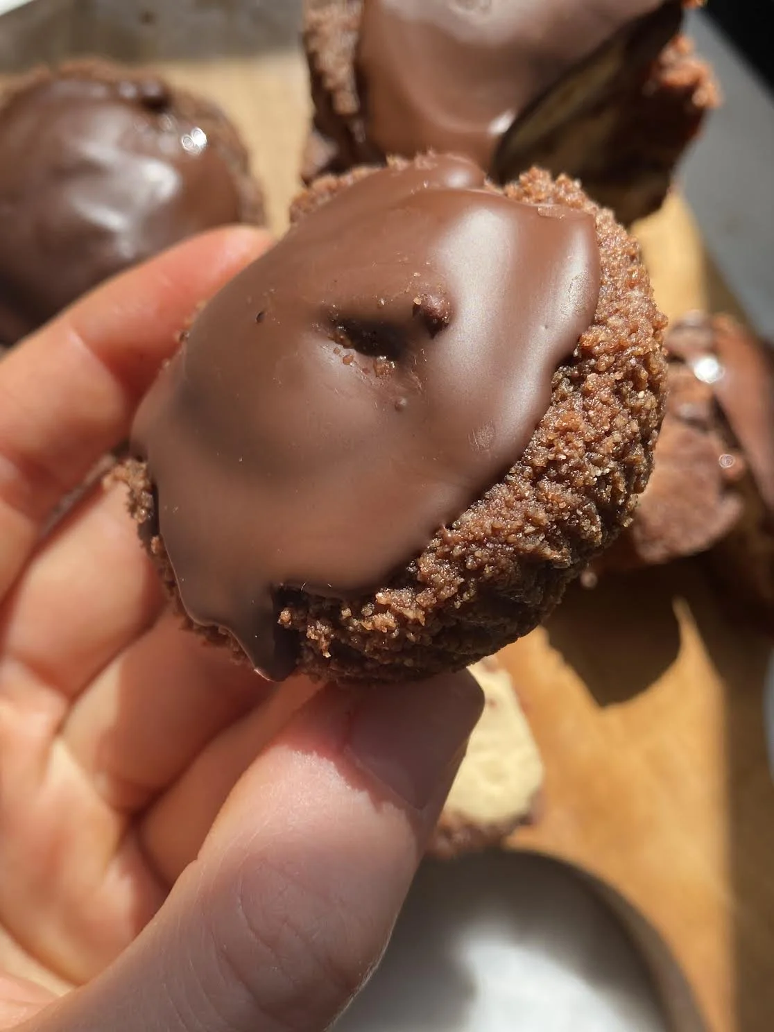 2. In a bowl combine the applesauce, sugar, and almond butter. Add in the cacao powder, almond flour, and coconut flour. Stir until a dough is formed. Fold in the chocolate chips.