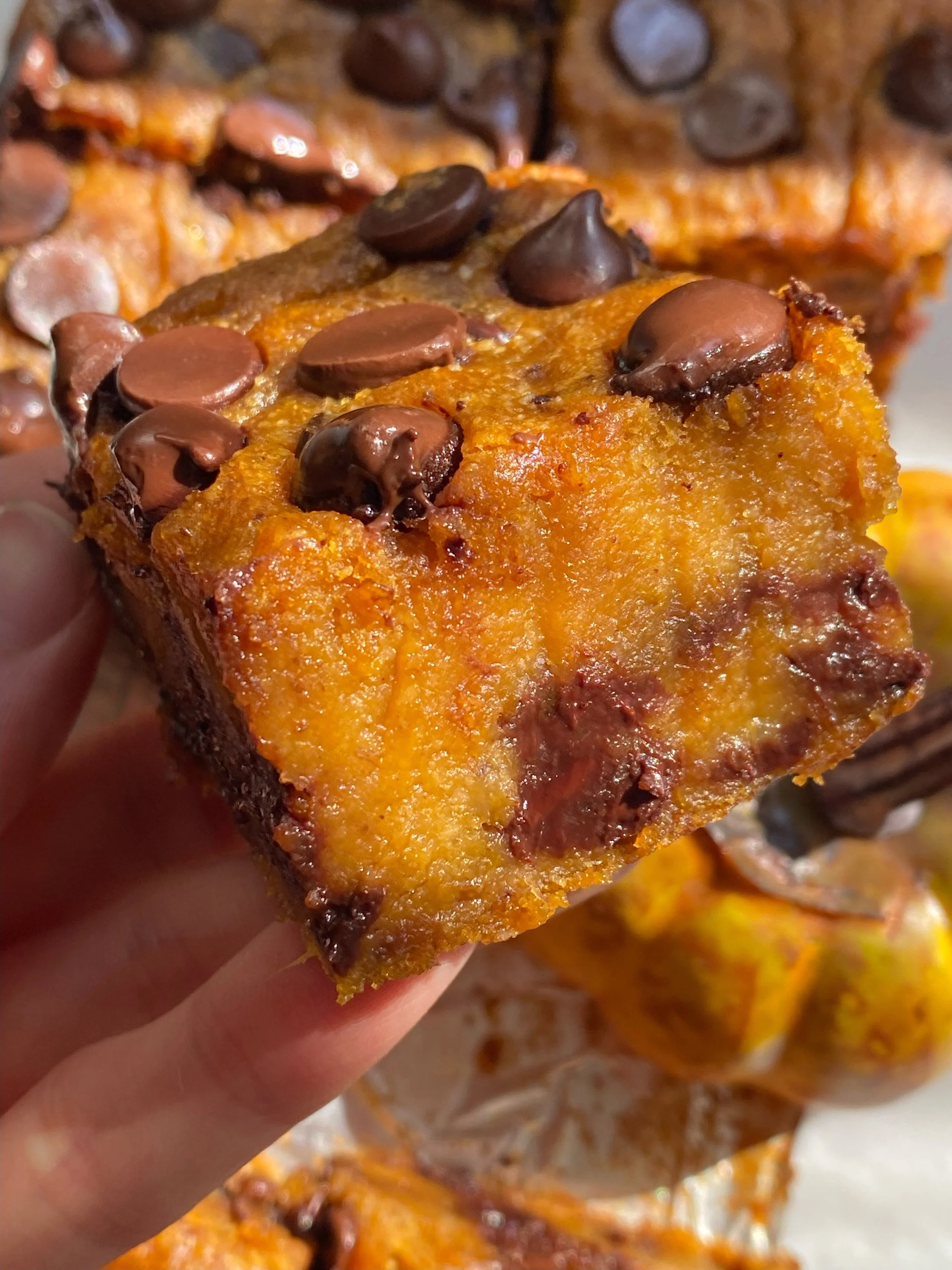 3. Add in the pumpkin pie spice, baking powder, almond flour, and all-purpose flour. Stir until a batter forms. Fold in the chocolate chips.