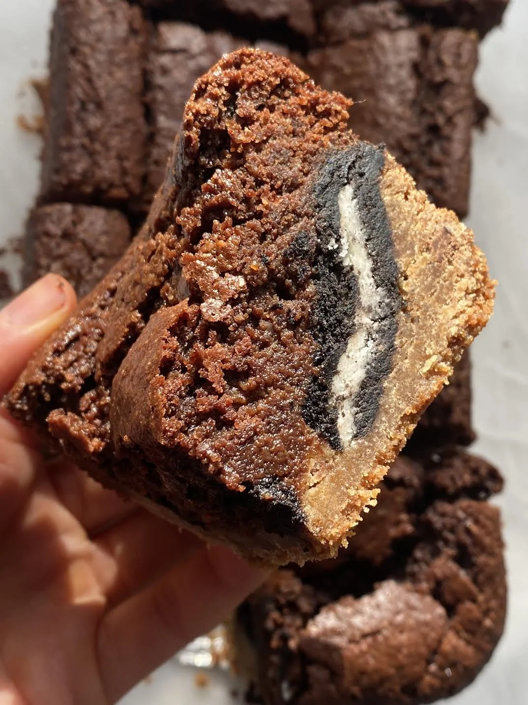 The base of the brownies is cookie dough then Oreos then brownie batter. If you wanted, you could also add chocolate chips or sprinkles to the brownie batter.