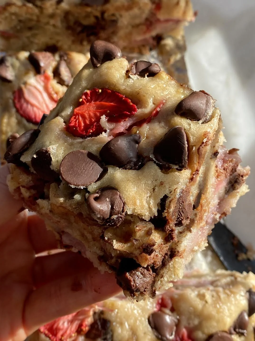 5. Transfer to the baking pan. Optional: top with more chocolate chips + sliced strawberries.