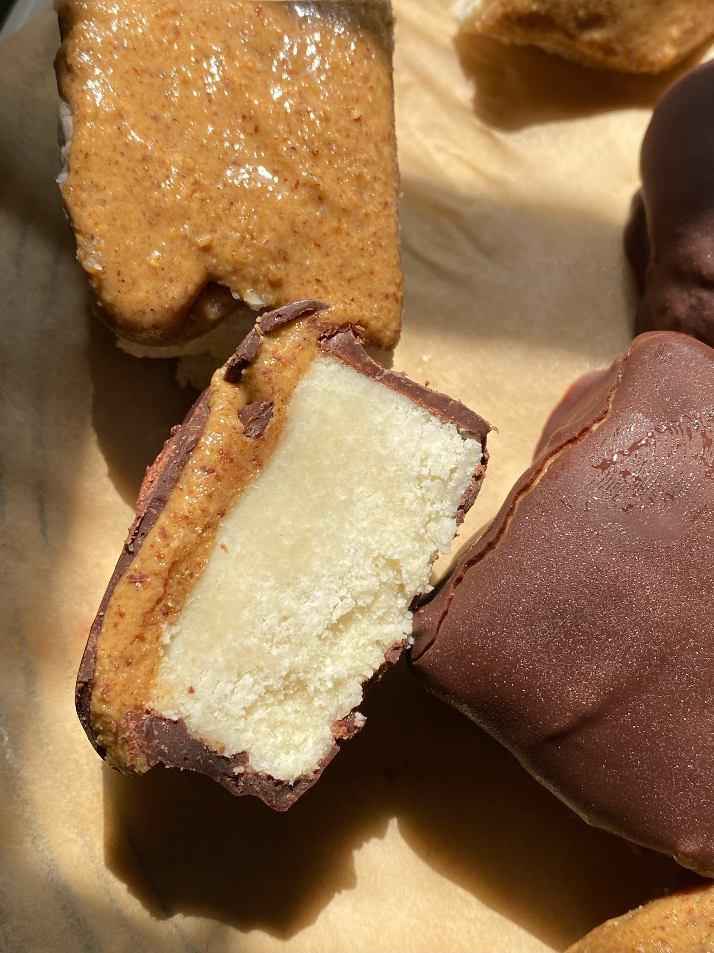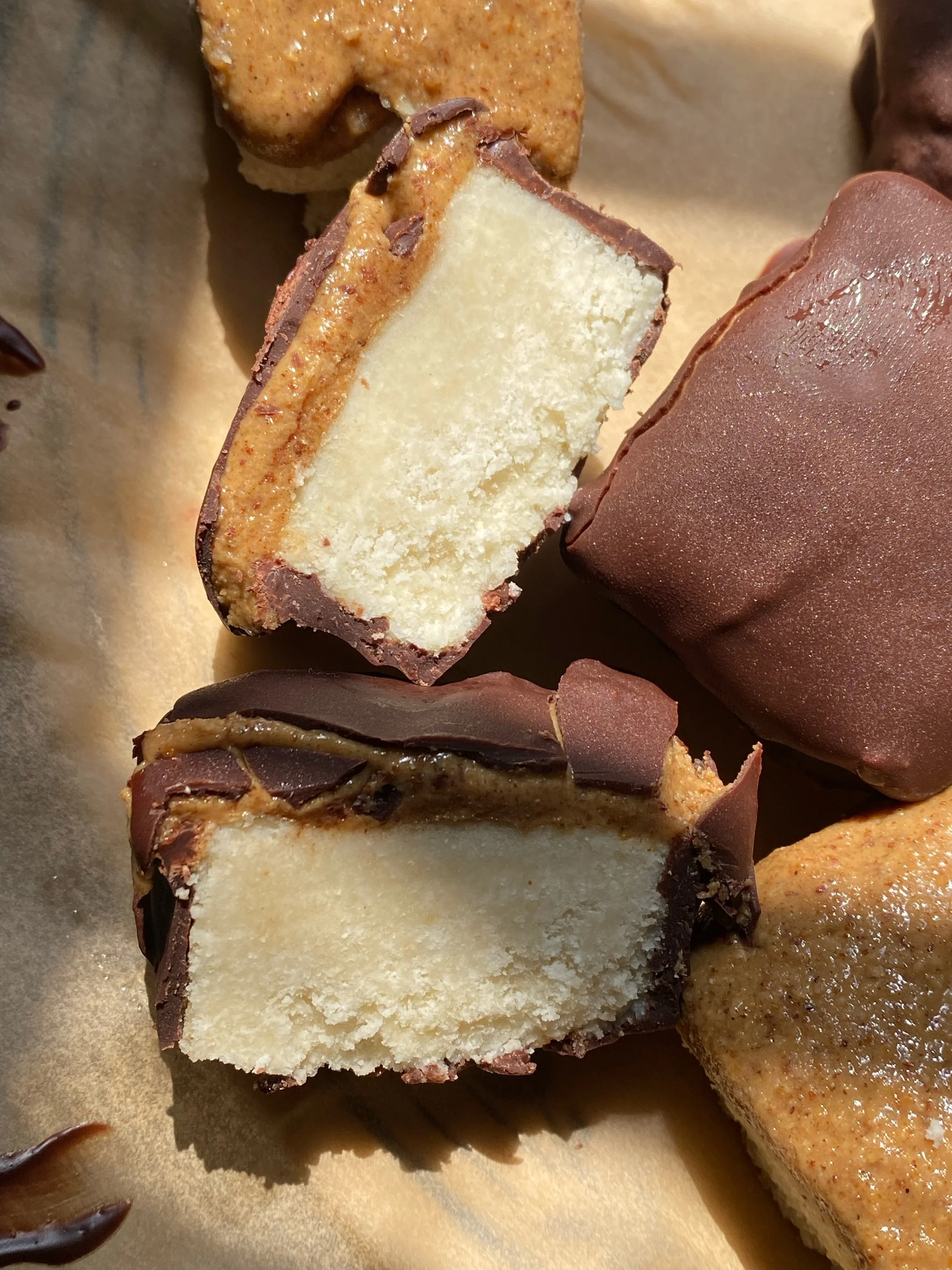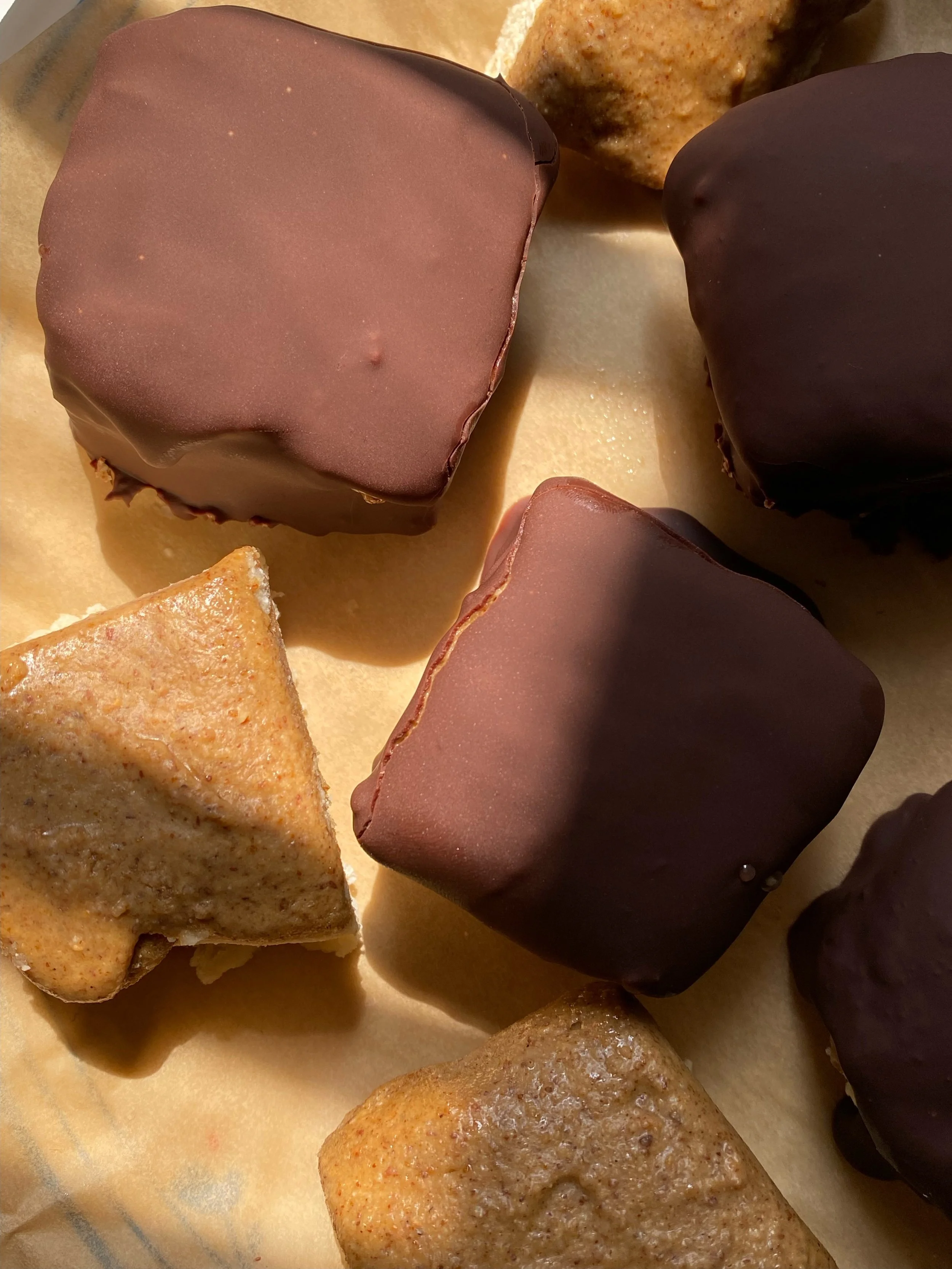 5. After the hour, cut into bite sizes or however you would like to cut the bites. Melt the chocolate and coat each bite into the chocolate. Place back in the freezer to allow the chocolate to harden (about 10-15 minutes).