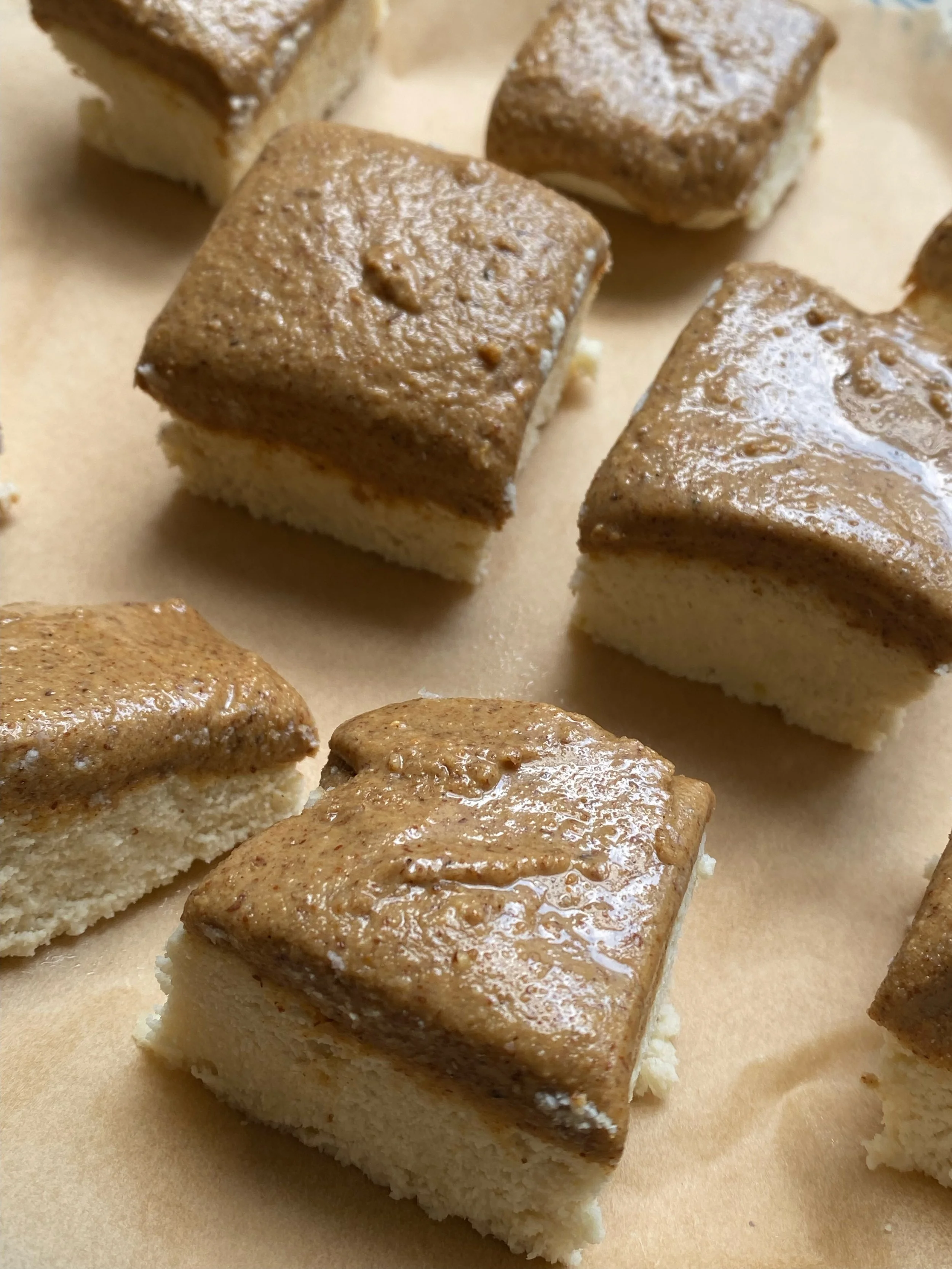 3. In a bowl combine the almond butter and protein powder. Add in the maple syrup as well if you are using. Stir until a thick paste forms. Add this on top of the dough.