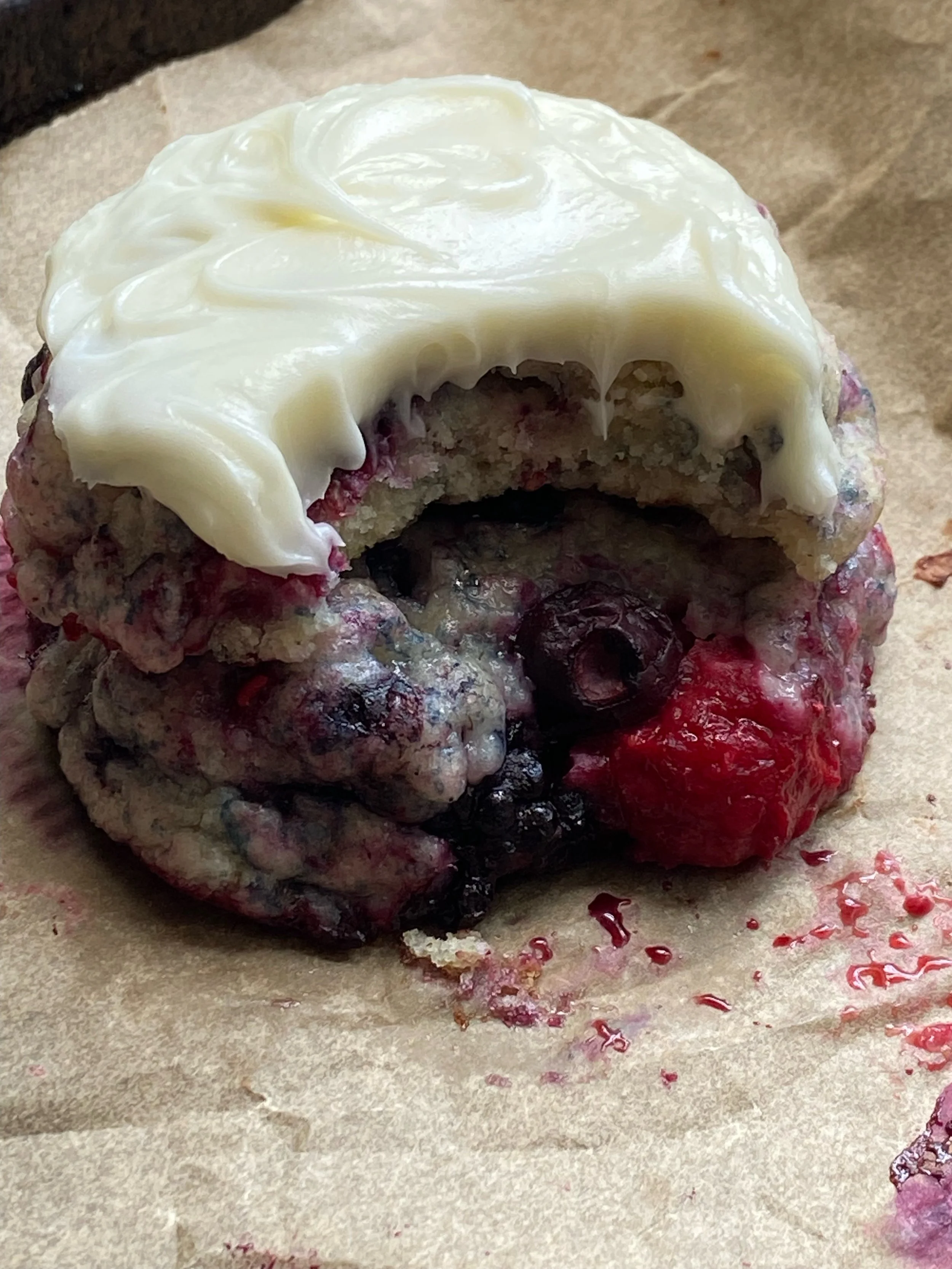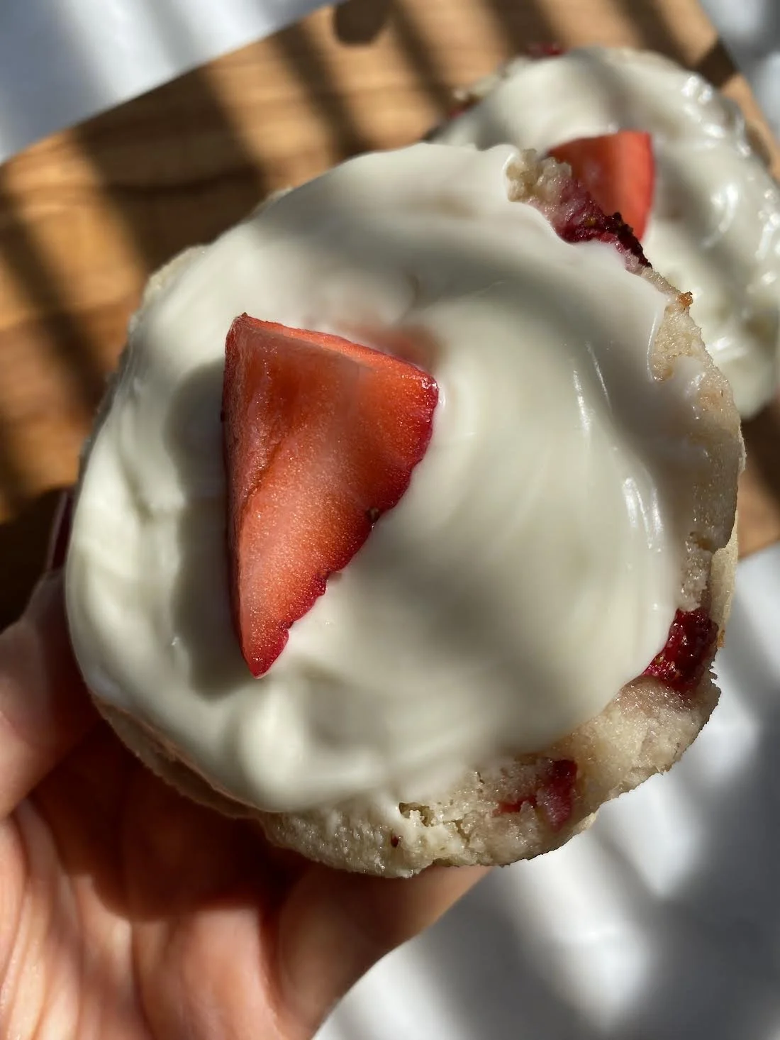 Sugar cookie base with chopped strawberries, topped with frosting.