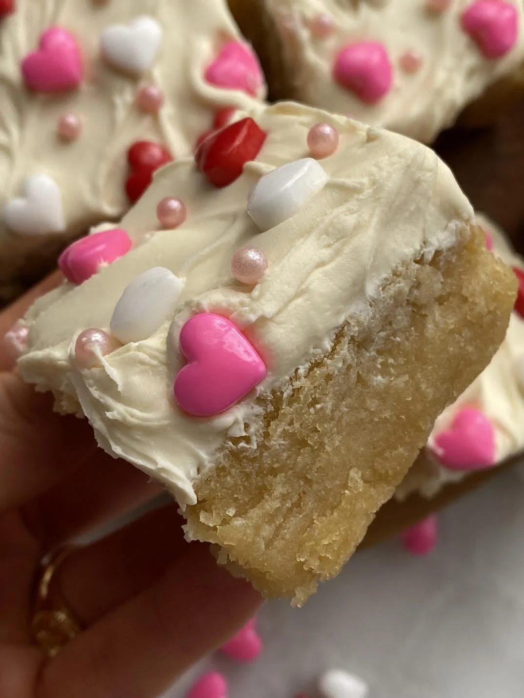 Sugar cookie based, coated in sprinkles, and topped with a chocolate heart.