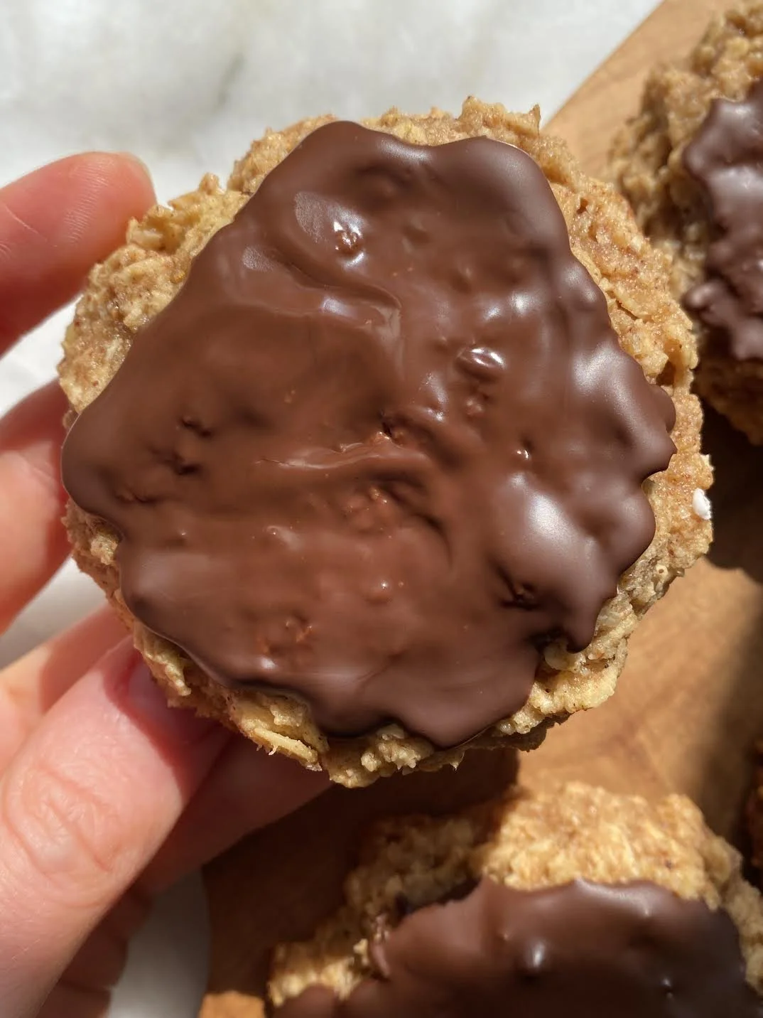 Dairy + gluten free chocolate iced oatmeal cookies.