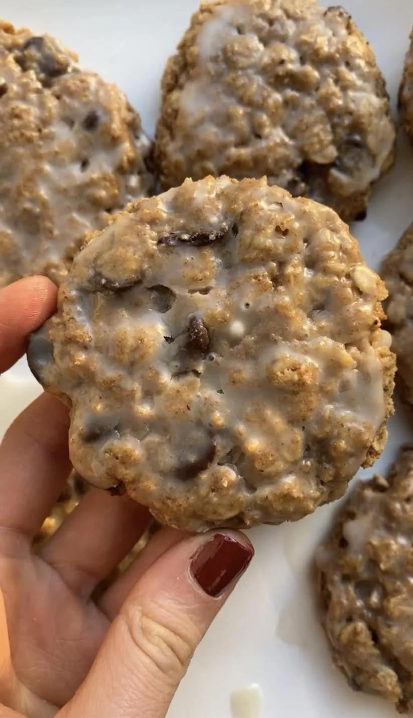 Dairy + gluten free iced oatmeal chocolate chip cookies.
