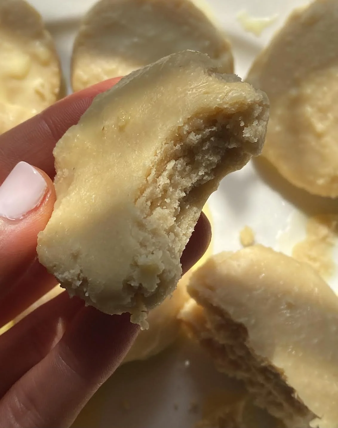 Vegan sugar cookie base topped with frosting & festive sprinkles.