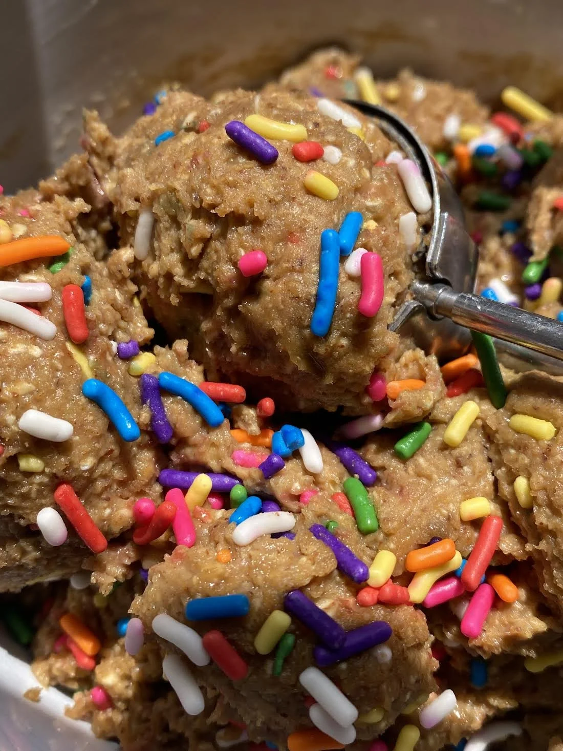Protein bites, chopped apple folded in, coated in powdered sugar.