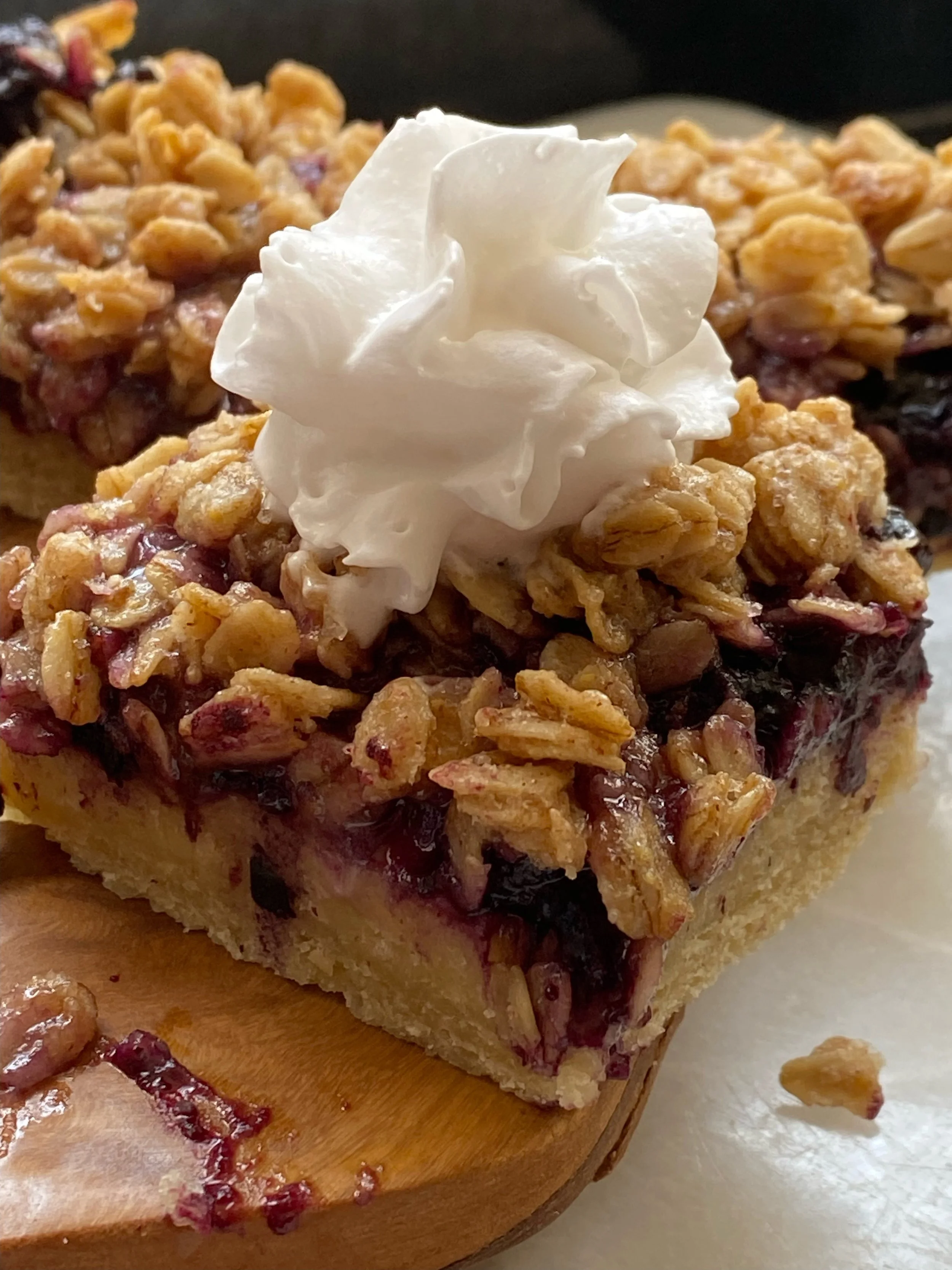 Shortbread crust, juicy blueberry filling, topped with an oat based crumble.