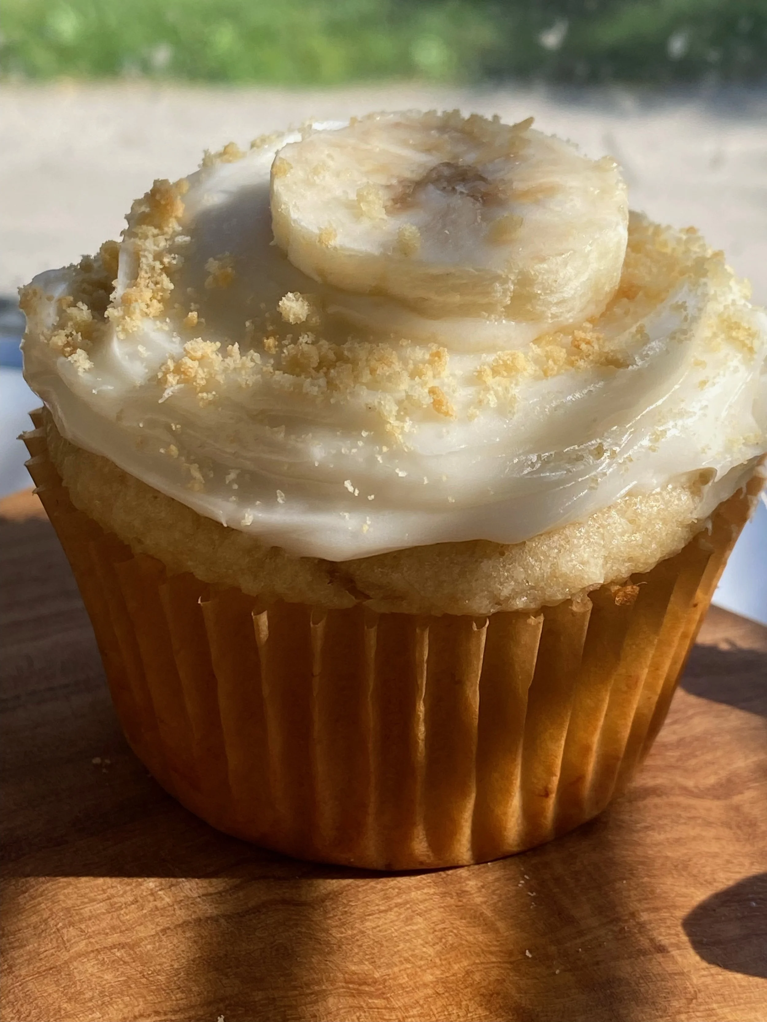 Sweet + fluffy banana cupcakes with frosting and crumbled cookies.